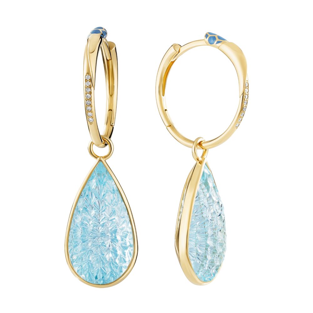 Коллекция «Заха Хадид». Выразительность идей архитектора находит воплощение в изящных переплетениях оправ и необычной огранке драгоценных камней. Заха прославилась своими проектами, искусно превращая камень, металл и стекло в пластичное кружево, поднимающееся к небесам немыслимыми волнами. Она — мастер фантазийных форм, и Natasha Libelle подчеркивает это в каждом украшении одноименной коллекции. Так, голубые топазы гарнитура «Морфей» огранены так, что кажутся завораживающими, как сон.