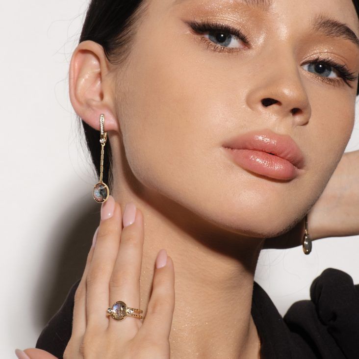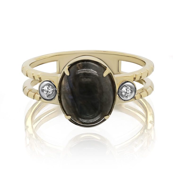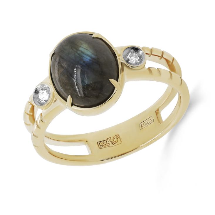 Кольцо из лимонного золота 585 пробы с бриллиантами и лабрадоритом от российского бренда Kabarovsky. Украшения с натуральными поделочными камнями по праву считаются одними из самых необычных и оригинальных. Натуральный поделочный камень с оригинальным узором, созданный самой природой, несомненно, станет центром внимания в вашем образе.