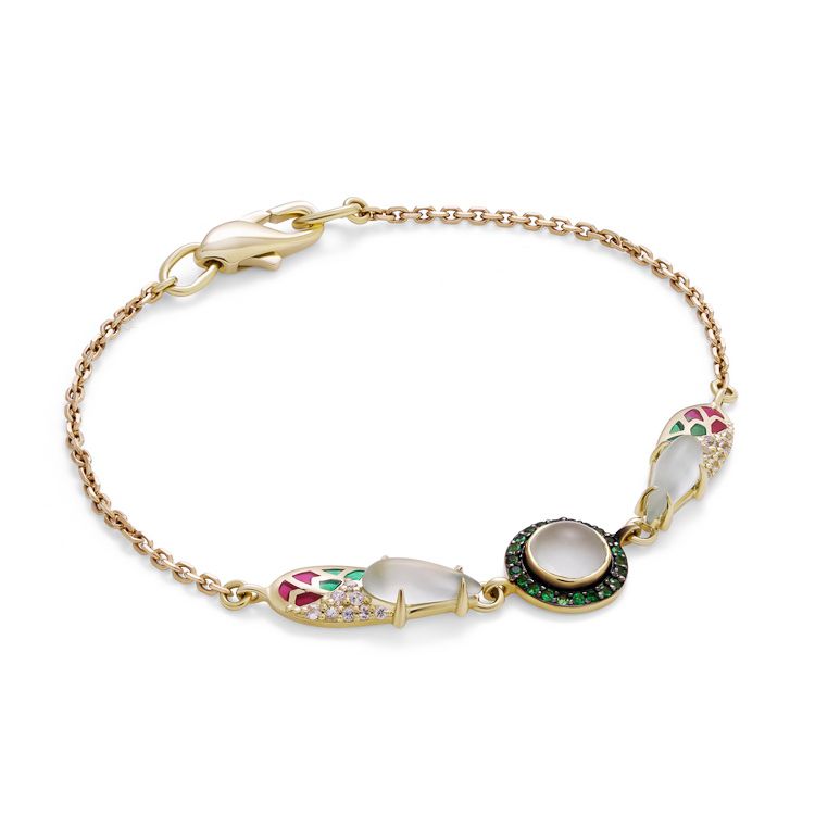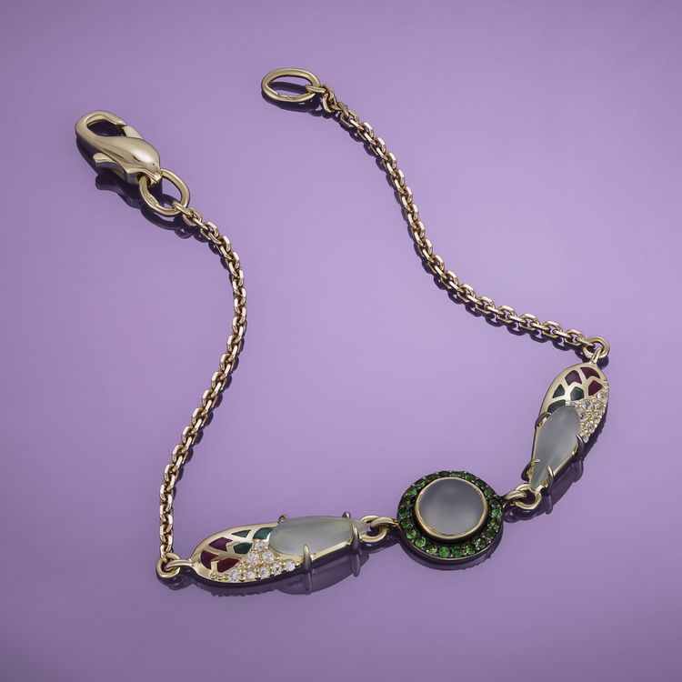 Главный символ коллекции Libelle — стрекоза и ее крылья, как отражение вечной женственности, любви, счастья и красоты, а также неповторимой стилистики модерна. Яркие краски витражной эмали, блеск натуральных драгоценных камней, безупречная огранка, сияние золота — все это соединилось в украшении, чтобы радовать и восхищать всех с первого взгляда. Что делает этот браслет неотразимым? Сверкающее изящество тонкой золотой цепочки, сияние камней, то яркое, то томное и глубокое, заметное при каждом движении? Пожалуй, все сразу. Добавим к красоте удобство и прочность, и получится украшение, которым можно украсить себя и в будни, и в праздники. Представьте, как невесомая золотая нить струится по вашему запястью, и вслед ее движению загораются драгоценные искры. Так умеют сиять только натуральные камни, звезды и капли дождя, оживающие в радуге. В комплект к браслету вы можете подобрать колье и серьги из коллекции Libelle, столь же невесомые, нежные и прекрасные!