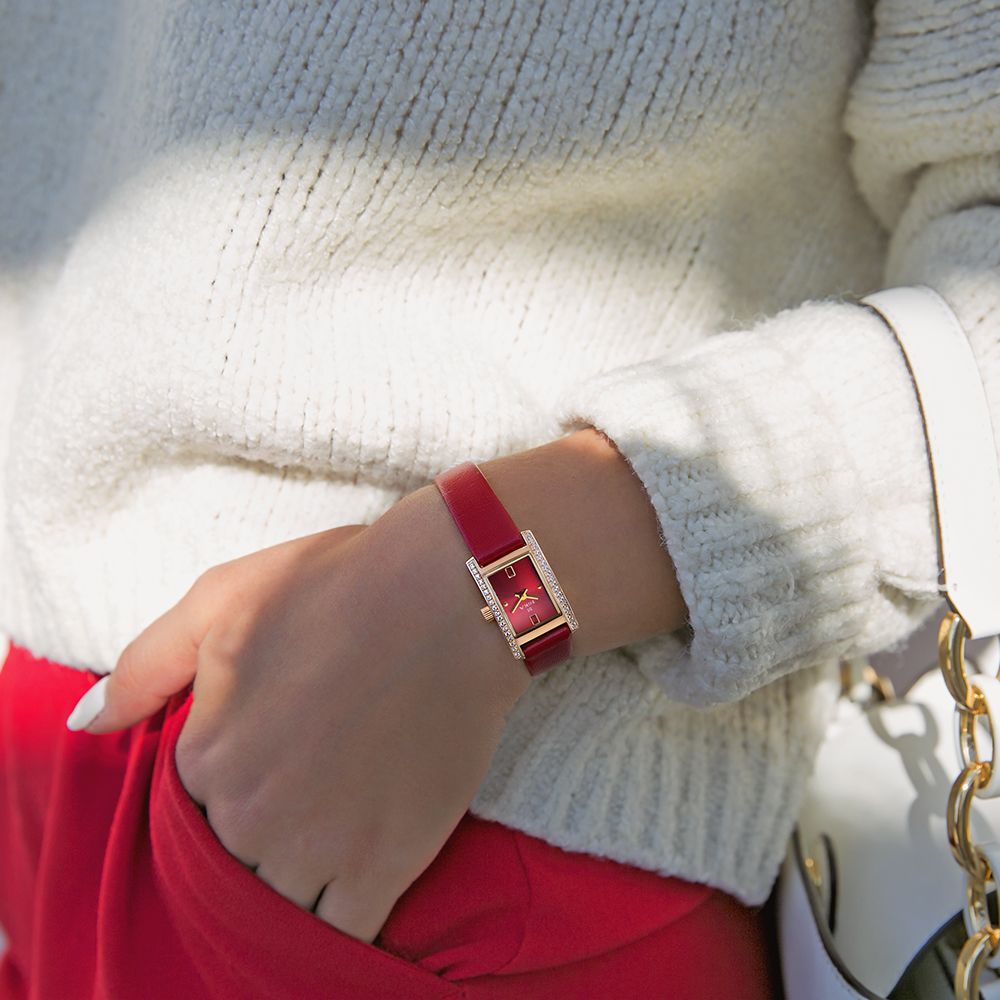 Золотой корпус женских часов выполнен из золота 585 пробы в форме компактного прямоугольника, декорированного фианитами. Минималистичные циферблаты насыщенных оттенков украшены сверкающими кристаллами изысканной огранки. Яркая и роскошная модель на каждый день. Минеральное стекло с сапфировым покрытием, что способствует большей твердости и устойчивости к царапинам. В комплекте натуральный кожаный ремешок.