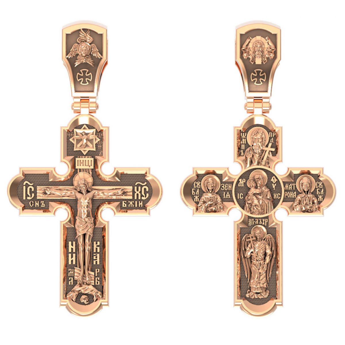 На лицевой стороне креста изображено Распятие Иисуса Христа. Господь представлен свободно покоящимся на кресте с простертыми руками и как бы обнимающим всю Вселенную. Верхняя перекладина символизирует титло — табличку, на которой, согласно Евангелию, было начертано: Иисус Назорей Царь Иудейский (IНЦI). Также Распятие сопровождается надписями, олицетворяющими Христа: святое имя Христа «IC» (Иисус) «ХС» (Христос), и словосочетание «СНЪ БЖIЙ» — СЫН БОЖИЙ. Рядом с образом Христа помещены слова - «НИКА» (греч. - Победитель) и четыре буквы «МЛ» «РБ» – Место Лобное Рай Бысть. Возвышение, на котором стоит Крест, символизирует гору Голгофу, на которой произошло Распятие. У подножия Креста изображают прах Адама, обозначенный черепом. На кулонном кольце изображен шестикрылый Серафим - самый приближенный к Господу Ангел.