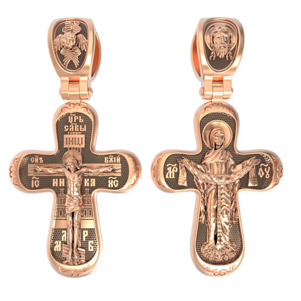 На обороте креста изображена икона Покрова Пресвятой Богородицы. На кулонном кольце изображен Спас Нерукотворный - Символ вочеловечившегося Божества и шестикрылый Серафим - самый приближенный к Господу Ангел.