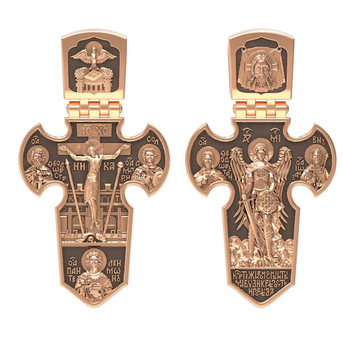 Оборот креста открывается величественной фигурой Архангела Михаила, архистратига Небесного воинства. Его имя означает «Кто яко Бог?», так как он самый могучий и грозный враг зла. С двух сторон от Архистратига Михаила предстоят еще два воина дружины Христовой: великомученик Феодор Тирон и мученик Иоанн Воин. В основании креста молитвенное обращение из Канона, написанного в XIV веке святым монахом Григорием Синаитом: «Кресте Живоносный, ты ми буди крепость и победа». Это молитва воина, восставшего против зла с любовью к ближнему, верой в Бога и надеждой на неизменную помощь Его Небесного Воинства.