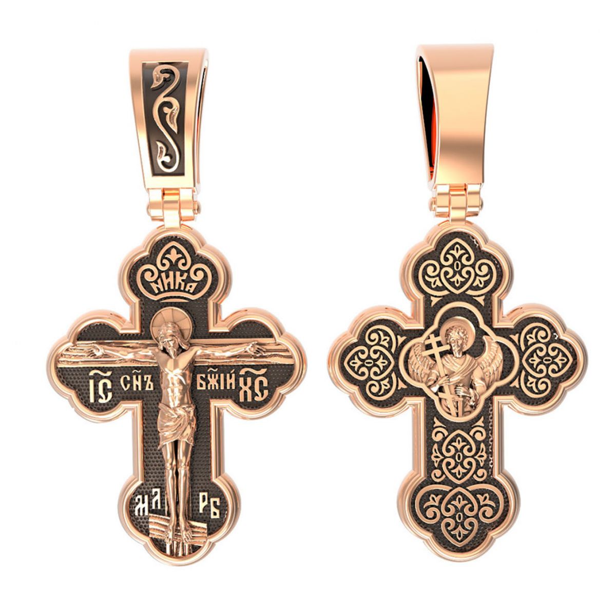 Крест нательный четырехконечный с трехлепестковыми завершениями перекладин. На лицевой стороне креста изображено Распятие, потому что это орудие казни Иисус Христос сделал орудием победы над грехом и смертью. Своими страданиями Он искупил грехи человечества, умерев и сошествовав во ад, победил сатану, освободил души праведников от вечной смерти и открыл им небесные врата рая. Жертва Христа сделала возможным спасение для каждого человека. На православном кресте Христос не умирает, а свободно простирает руки, ладони Иисуса открыты, будто он хочет обнять все человечество, даря им свою любовь и открывая путь к вечной жизни. Над головой Христа надпись – «НИКА» (греч. - Победитель). С обеих сторон горизонтальной перекладины надписи – монограмма святого имени Христа – «ИС ХС», а рядом с ней словосочетание «СНЪ БЖIЙ» — «СЫН БОЖИЙ». Две пары букв на кресте «МЛ» «РБ» означают: Место Лобное Рай Бысть. Возвышение, на котором стоит Крест, символизирует гору Голгофу, на которой произошло Распятие. У подножия Креста изображают прах Адама, обозначенный черепом.