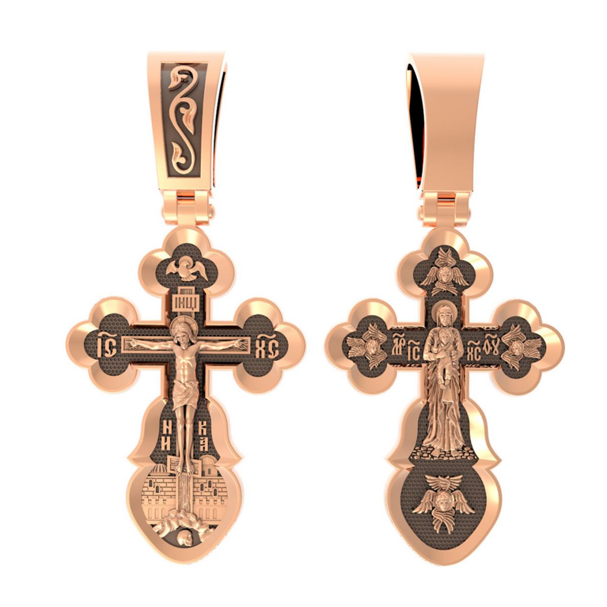 Основа композиции лицевой стороны креста занята Распятием на горе Голгофе. Позади Распятия видна иерусалимская стена, знак того, что Господь был распят вне стен города. Распятие сопровождается иконографическими надписями, прославляющими Господа Иисуса Христа. На боковых оконечностях размещены инициалы святого имени Спасителя «IС ХС» и надпись «Сын Божий», обозначающая Его божественную природу. На подножии Креста можно прочитать надпись «НИКА» (Победитель) – символ победы Господа над смертью. Венчает лицевую сторону образ Святого Духа в виде голубя.