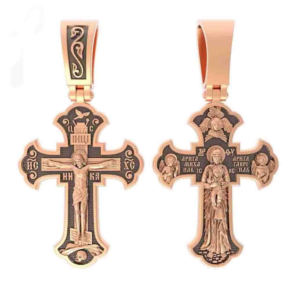 На лицевой стороне креста изображено Распятие, потому что это орудие казни Иисус Христос сделал орудием победы над грехом и смертью. На православном кресте Христос не умирает, а свободно простирает руки, ладони Иисуса открыты, будто он хочет обнять все человечество, даря им свою любовь и открывая путь к вечной жизни. Над титлом помещена аббревиатура «ЦС» (Царь Славы). Верхняя перекладина символизирует собой табличку с надписью «IHЦI» - Иисус Назарянин Царь Иудейский. Возле перекладины пишется сокращенно имя Спасителя "IC XC" - Иисус Христос, ниже перекладины добавляется: "НИКА" (греч. - Победитель). Возвышение, на котором стоит Крест, символизирует гору Голгофу, на которой произошло Распятие. У подножия Креста изображают прах Адама, обозначенный черепом.