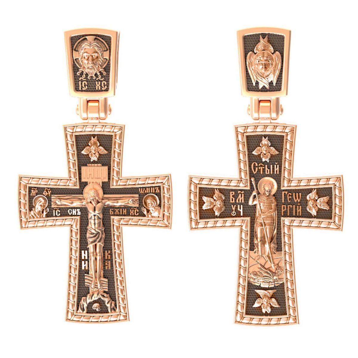 В центре оборотной стороне креста помещен образ Святого Великомученика Георгия Победоносца - одного из самых почитаемых и удивительных святых. На Руси он известен как Юрий или Егорий, покровитель воинов, помощник в крестьянском труде. На образке он изображен как воитель поражающий копьем огнедышащего змея. Змей символизирует собою сатанинские силы. Молитвами вознесенными к Всевышнему и своей непреклонной верой он смог одолеть чудовище. Вокруг образа изображены четыре Серафима.