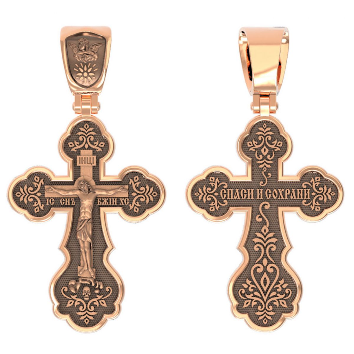 На оборотной стороне креста помещена молитва обращенная к Господу: «Спаси и сохрани». Крест украшен растительным орнаментом.