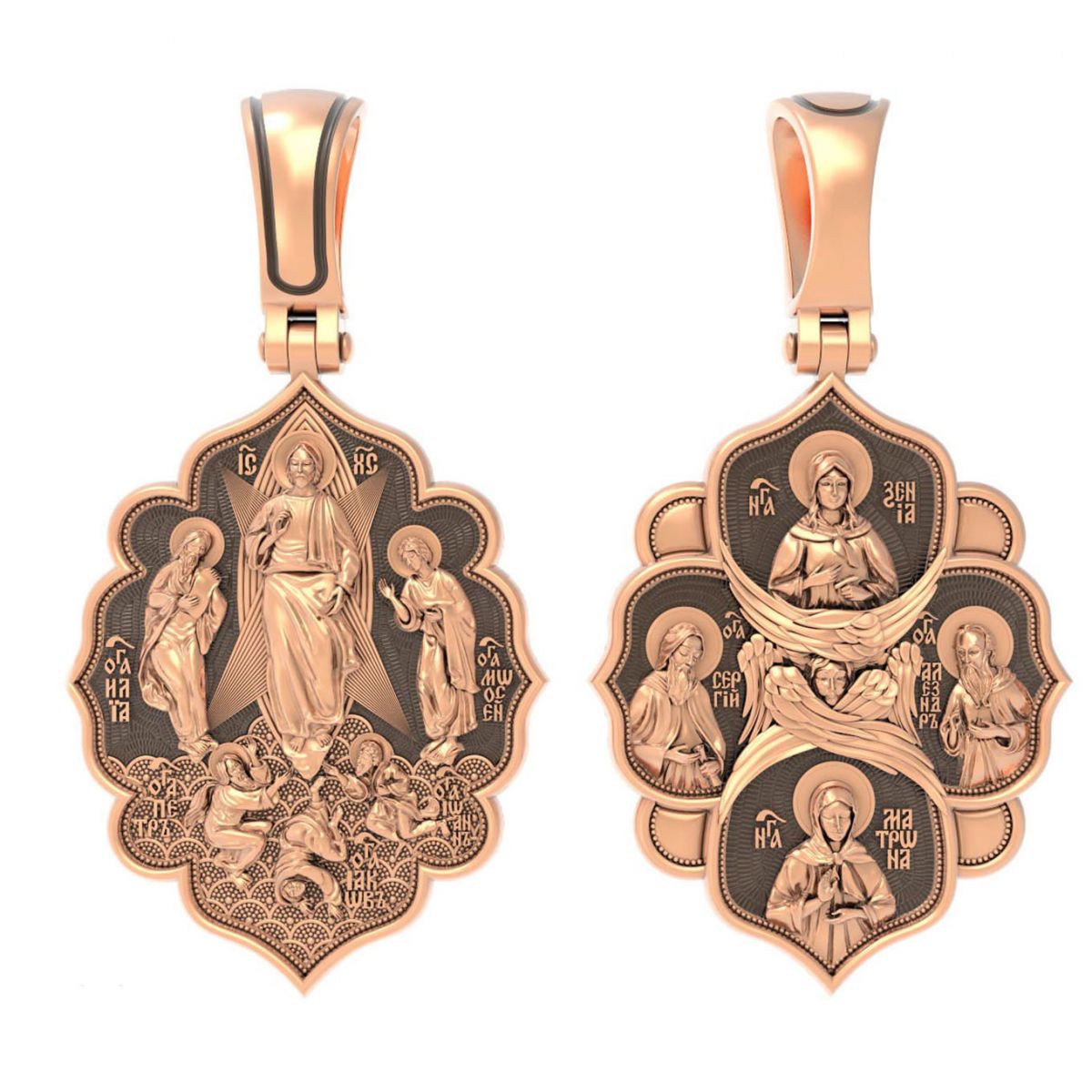 На лицевой стороне образка изображена икона «Преображение». Образ являет Господа Иисуса Христа в тот момент, когда Он предстал трем Своим ученикам: Петру, Иакову и Иоанну Богослову. Пророки Моисей и Илия предстояли рядом и беседовали с Ним. На иконах «Преображение» они так и изображаются — лежащими у ног Христа.