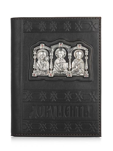 Обложка для документов «Оберег» выполнена вручную из телячьей кожи и украшена серебряной плакеткой высокой степени проработки.