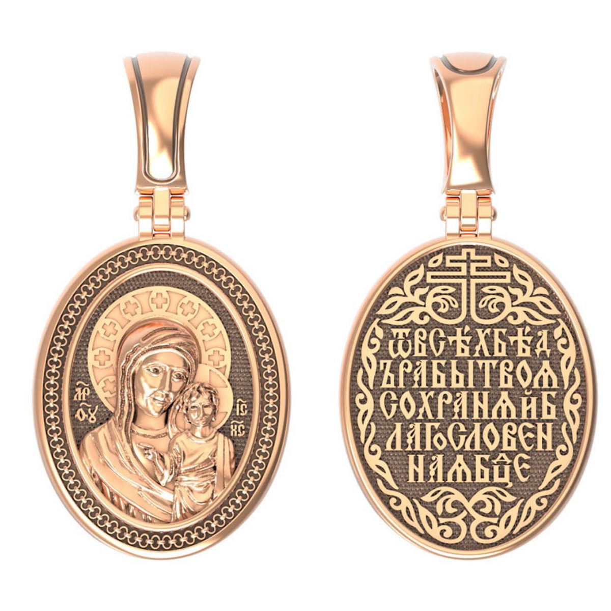 На лицевой части образка изображена Казанская икона Божией Матери — одна из самых почитаемых в России чудотворных икон Богородицы. Богословское значение Казанской иконы — указать верующим истинный Путь к спасению, который лежит через Христа. Только Божия Матерь имеет настолько сильное дерзновение к Спасителю, что может ходатайствовать перед Ним за всех верных. Молитва перед Казанской иконой Божьей Матери помогает во всех сложных случаях жизни, в болезнях, во всех печалях, невзгодах, скорбях.