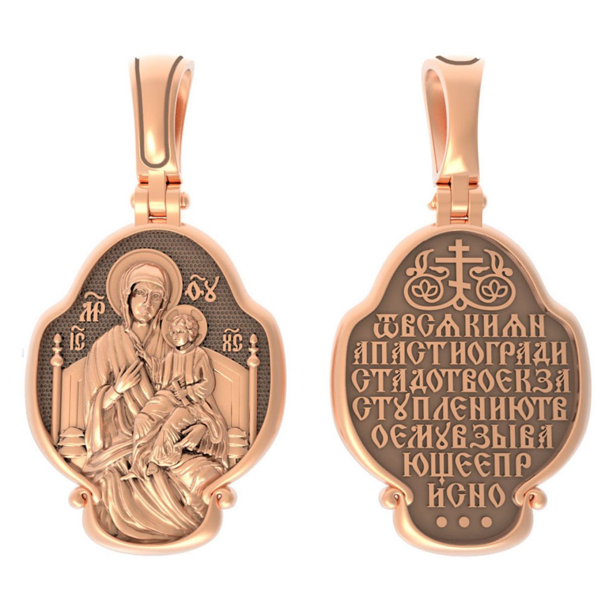 В центр образка помещен образ Божией Матери «Всецарица», восседающая на царском троне. На руках Ее – Богомладенец Иисус Христос со свитком в левой руке. Пальцы Его правой руки сложены в благословляющем жесте. Само название иконы (по-гречески «Пантанасса») – Всегоспожа, Всеповелительница – говорит о ее особой, всеобъемлющей силе. Изначально икона почиталась как защитница от нечистой силы и колдовства. Но когда стали распространяться опухолевые заболевания, считавшиеся следствием порчи и сглаза, выяснилось, что молитва к иконе помогает в борьбе с ними. Болезнь не всегда проходит полностью, но часто замедляется или останавливается на той стадии, на которой человек обратился за помощью к Божией Матери перед ее иконой «Всецарица».