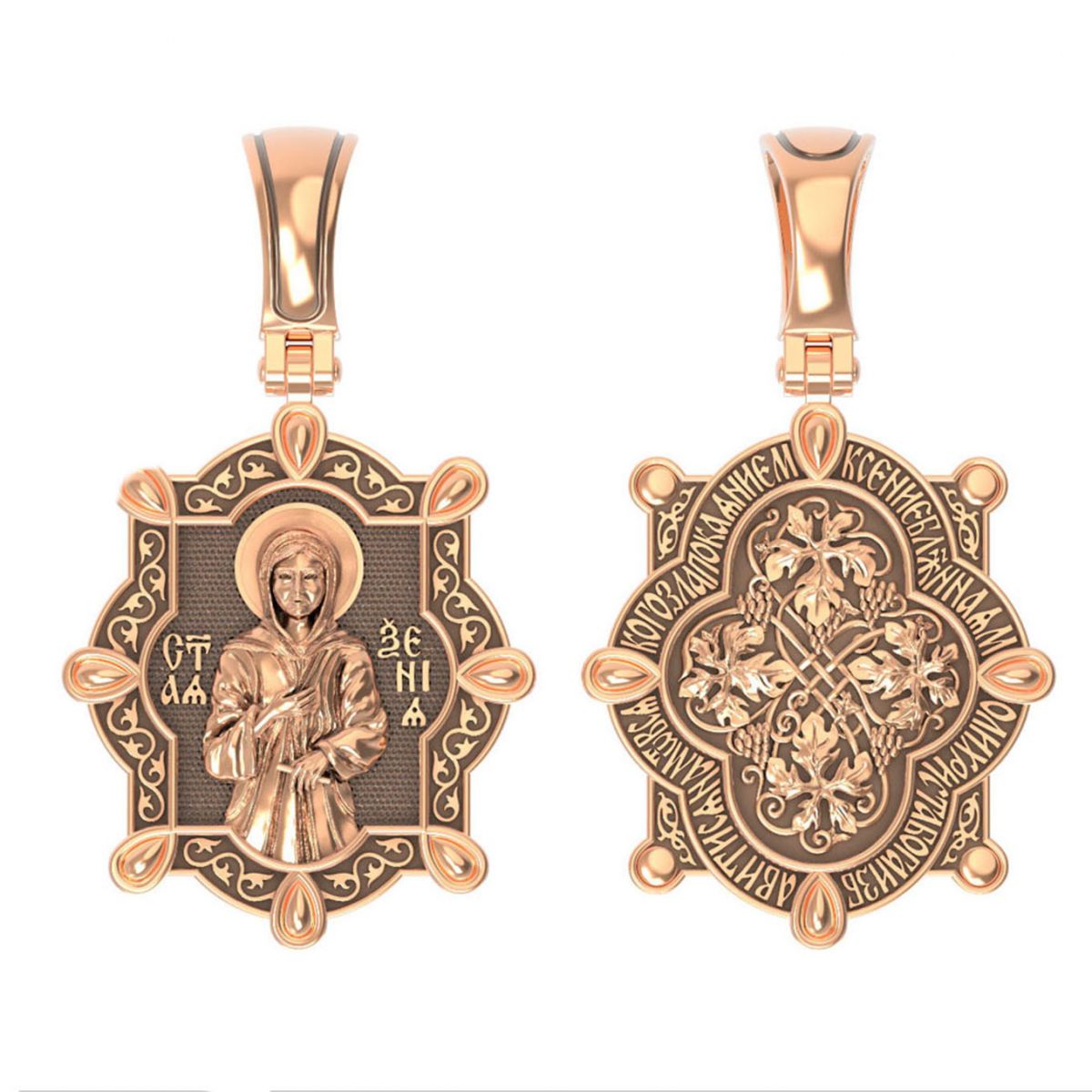 На оборотной стороне изображена виноградная лоза – символы церкви и евхаристии. Вокруг образка написана молитва: «Ксение блаженная, моли Христа Бога избавитися нам от всякаго зла покаянием».