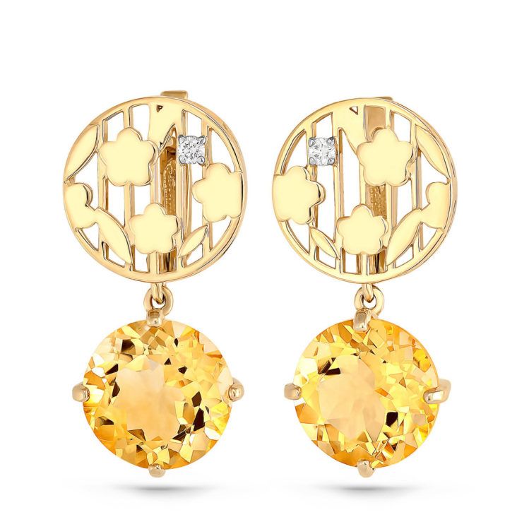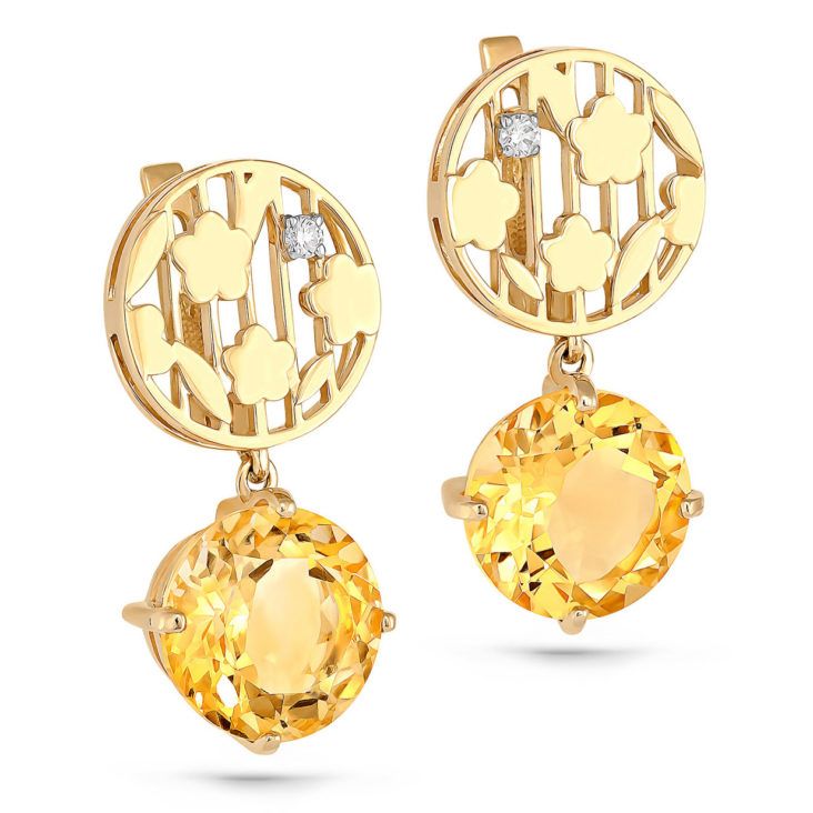 Серьги из желтого/лимонного золота 585 пробы с бриллиантами и цитринами от российского бренда Kabarovsky. Разнообразие натуральных полудрагоценных камней по истине велико. Их красота во все времена притягивали к себе, как ювелиров, так и ценителей красивых украшений. Ценность украшений с полудрагоценными камнями заключается не только в их красоте и многообразии, но в их свойствах, приписываемых им. В опытных руках мастеров Kabarovsky радужные самоцветы превращаются в произведения искусства в обрамлении драгоценных металлов.
