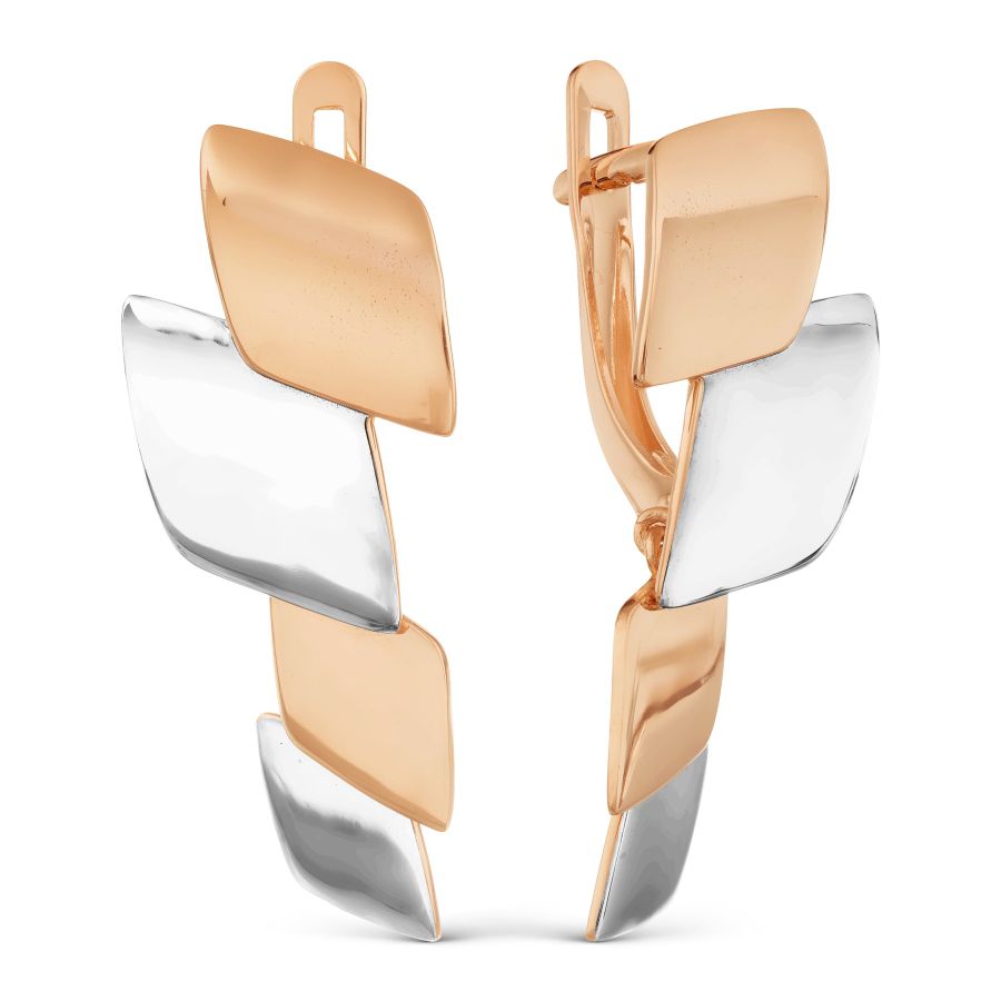 Интересные серьги из комбинированного золота 585 пробы отлично подчеркнут ваш безупречный вкус. Английский вид замка с подвесным элементом.