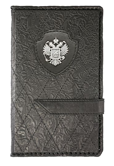Визитница представительского класса «Держава» выполнена вручную из телячьей кожи и украшена серебряным гербом России высокой степени проработки.